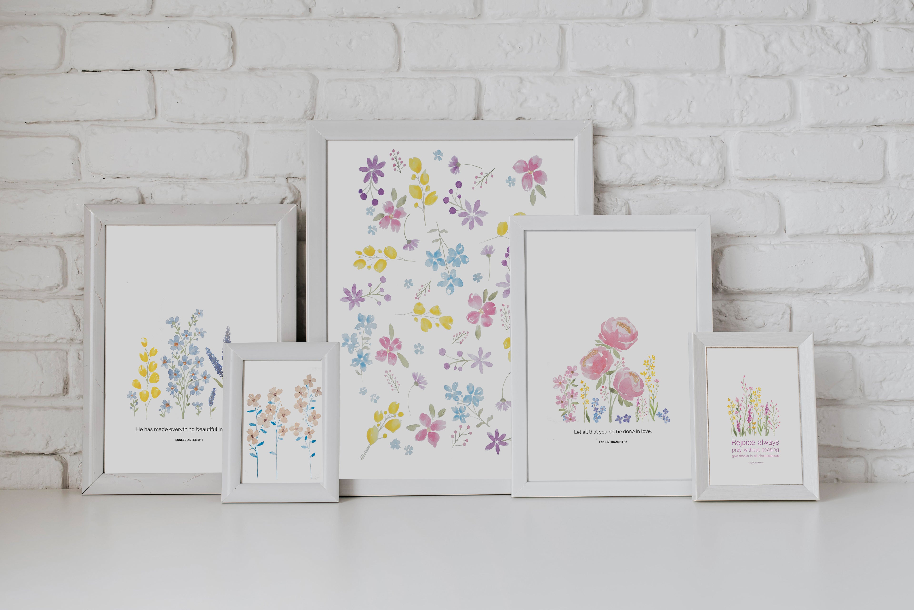Each piece in this collection is a testament to the design and elegance of flowers, reflecting the divine craftsmanship of our Creator. The soft hues and strokes of watercolours add a touch of tranquility and peace, mirroring the calm and comfort that God brings to our hearts in times of need.